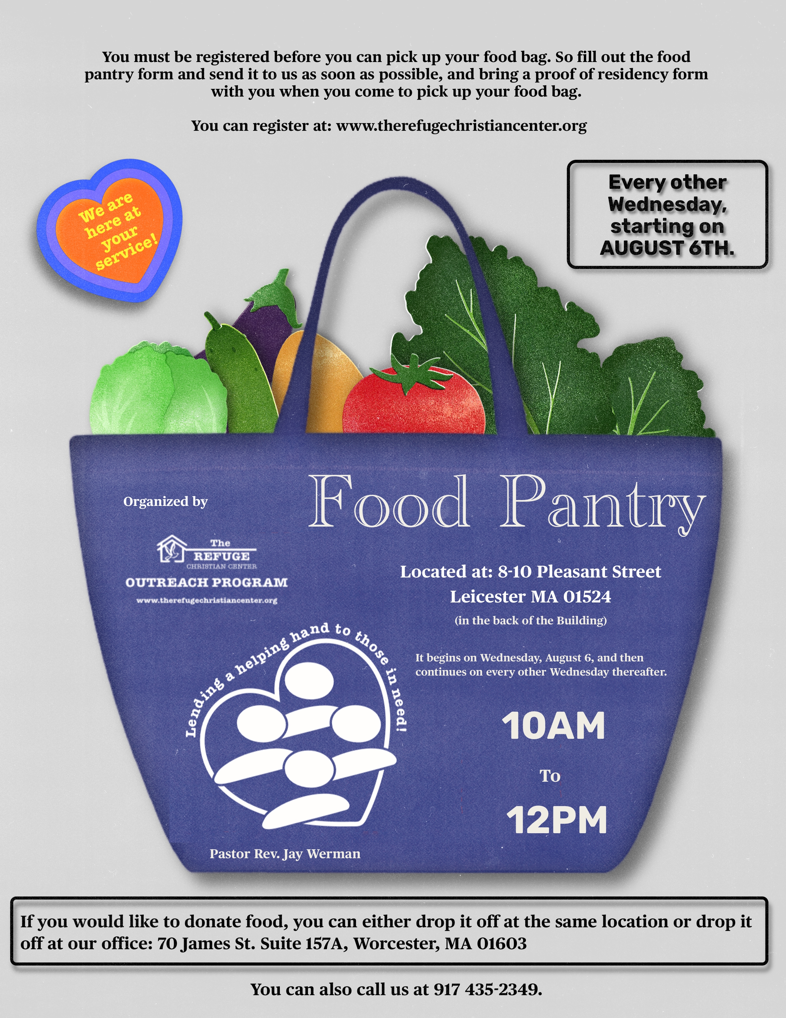 We require anyone who wishes to receive food from our program to register in advance. This helps us manage our food resources more effectively and ensures that others will receive food as well. After filling out the food pantry form, you will be able to pick up a bag of food twice a month. This program is designed to provide food assistance to the city of Leicester and surrounding areas. Therefore, please complete the form one week in advance with proof of residency (i.e. phone bill, utility bill, etc.) and we will have a bag of food ready for you.